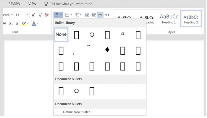ওয়ার্ড ডকুমেন্টের হোম ট্যাবে, বুলেট লিস্ট বোতামের ডান পাশের ছোট তীর চিহ্নে ক্লিক করুন। কোনো বক্স না দেখা গেলে ড্রপ ডাউন মেনু থেকে ‘ডিফাইন নিউ বুলেট’ অপশপটি বেছে নিন।