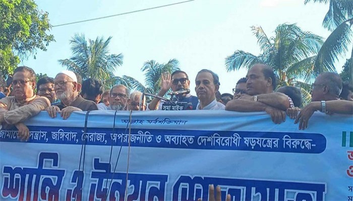 এক দফা দাবিতে আজ ১৮ জুলাই (মঙ্গলবার) পদযাত্রা করেছে বিএনপি। এই পদযাত্রার মধ্যেই রাজনৈতিক দলটির পতন যাত্রা শুরু হয়েছে বলে মন্তব্য করেছেন আওয়ামী লীগের সাধারণ সম্পাদক ও সড়ক পরিবহণ এবং সেতুমন্ত্রী ওবায়দুল কাদের। রাজধানীর রমনা ইঞ্জিনিয়ার্স ইন্সটিটিউশনের সামনে থেকে শোভাযাত্রার আগে শান্তি ও উন্নয়ন সমাবেশে এই মন্তব্য করেন তিনি। এ সময় ওবায়দুল কাদের প্রশ্ন রেখে বলেন, ‘ইউরোপীয় ইউনিয়ন (ইইউ), আমেরিকানরা কি দিয়েছে? বিএনপিকে দিয়েছে ঘোড়ার ডিম।’