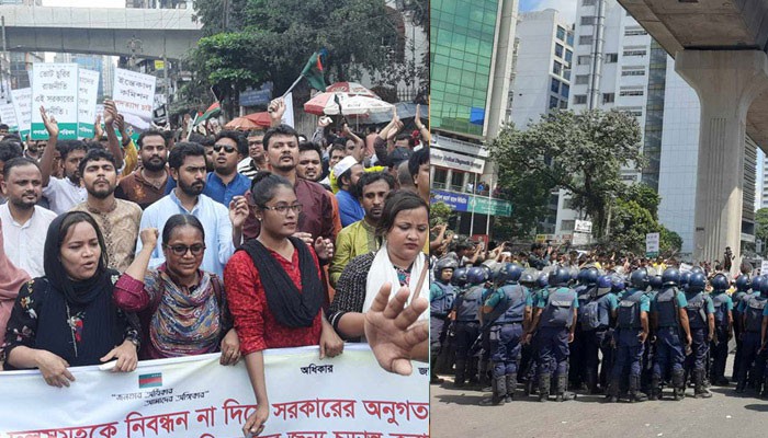 আজ মঙ্গলবার দুপুর সাড়ে ১২টার দিকে রাজধানীর পল্টনের প্রীতম-জামান টাওয়ারের সামনে থেকে মিছিলটি শুরু হয়। গুলিস্তান জিরো পয়েন্ট-কদমফোয়ারা-মৎস্য ভবন ও শাহবাগ হয়ে মিছিলটি পৌনে ২টায় বাংলামোটরে পৌঁছার পর পুলিশের বাধার মুখে পড়ে।