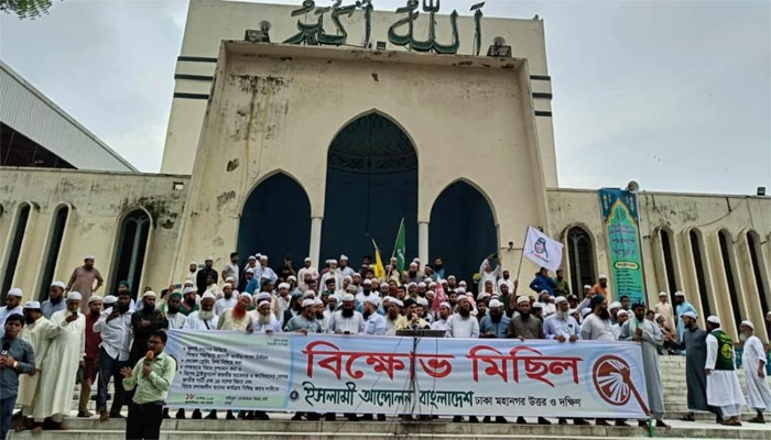 বাংলাদেশ ইসলামী আন্দোলনের ঢাকা মহানগর উত্তর ও দক্ষিণ শাখার ডাকে বিক্ষোভ মিছিলে অংশ নিতে দুপুরে দলে দলে জড়ো হতে থাকেন নেতাকর্মীরা। জোহরের নামাজের পরপর কোরআন তিলাওয়াতের মধ্য দিয়ে শুরু হয় বিক্ষোভ-মিছিল পূর্বক সমাবেশ।