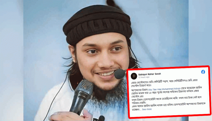 আজ ১১ অক্টোবর (শনিবার) ভোরে নিজের ফেসবুক অ্যাকাউন্ট থেকে দেওয়া এক পোস্টে তিনি দাবি করেন, আবু ত্বহা মুহাম্মদ আদনান প্রেমে মজেছেন জারিন জেবিন নামক তার ১৫ বছর পূর্বের কলেজ লাইফের প্রিয়তমা বর্তমান এয়ার হোস্টেস্টের। ওই নারীর সঙ্গে যোগাযোগ রাখছেন এবং ব্যক্তিগতভাবে দেখা করেন।