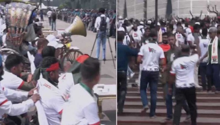 এ সময় বিক্ষোভ করতেও দেখা যায় জুলাই যোদ্ধাদের। মঞ্চ থেকে মাইকে ঘোষণা দিয়ে তাদের শান্ত হয়ে আসন গ্রহণের আহ্বান জানানো হয়। মূল মঞ্চ এবং অতিথিদের জন্য নির্ধারিত স্থানে বসে পড়েন জুলাই যোদ্ধারা।