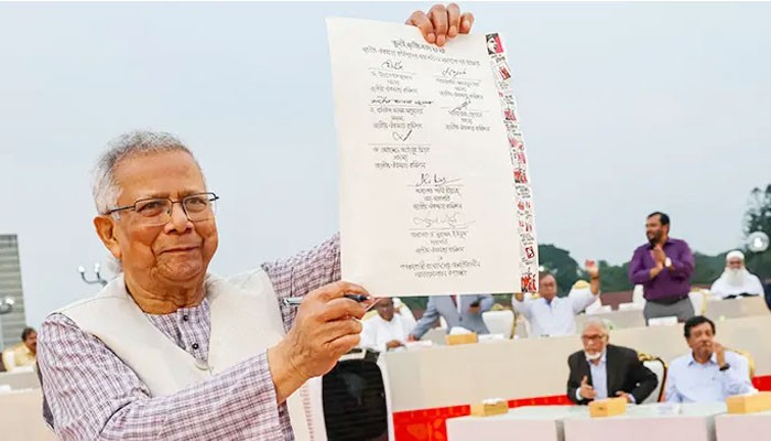 জুলাই জাতীয় সনদে অন্তর্বর্তী সরকারের প্রধান উপদেষ্টা অধ্যাপক ড. মুহাম্মদ ইউনূসসহ ঐকমত্য কমিশনের সদস্যরা এবং রাজনৈতিক দলের নেতারা স্বাক্ষর করেছেন। ১৭ অক্টোবর (শুক্রবার) বিকেল ৫টার দিকে আনুষ্ঠানিকভাবে এ সনদে স্বাক্ষর করা হয়।